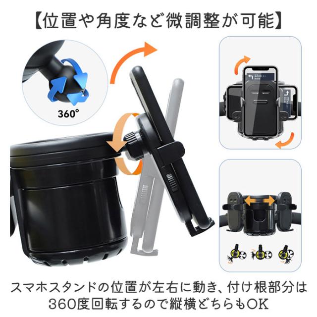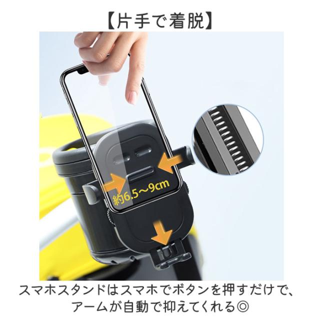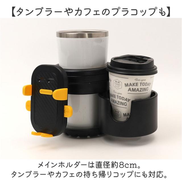 | サイズ | 【ドリンクホルダー】 [縦]約12cm/[横]約10.5cm/[奥行]約10.5cm 【スマホホルダー】 [縦]約11cm/[横]約6.5〜9cm(調節可能)/[奥行]約3.5cm 【取付クランプ】 [開口幅]最大約3.5cm(調節可能) ※サイズは当店計測の実寸サイズです。実際の商品ならびにメーカー表記サイズとは多少の誤差が生じる場合がございます。あらかじめご了承ください。 |