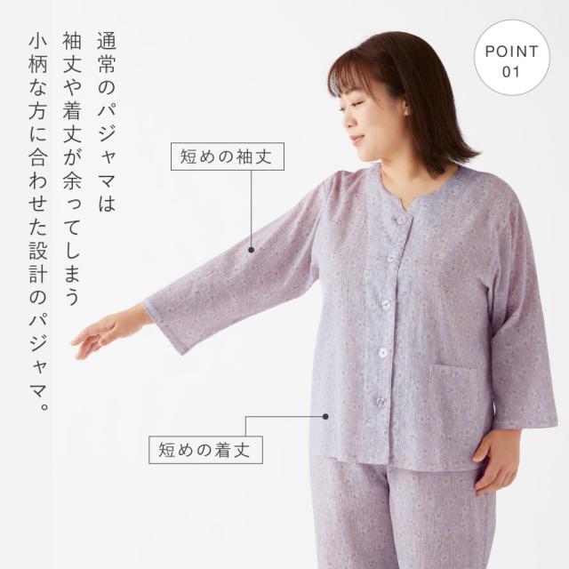 一般的なパジャマでは袖丈や着丈が余ってしまう小柄・低身長の方にも合いやすいよう、身幅はゆったりとしたまま、着丈と袖丈を短めに調整したプチサイズ設計を採用しています。