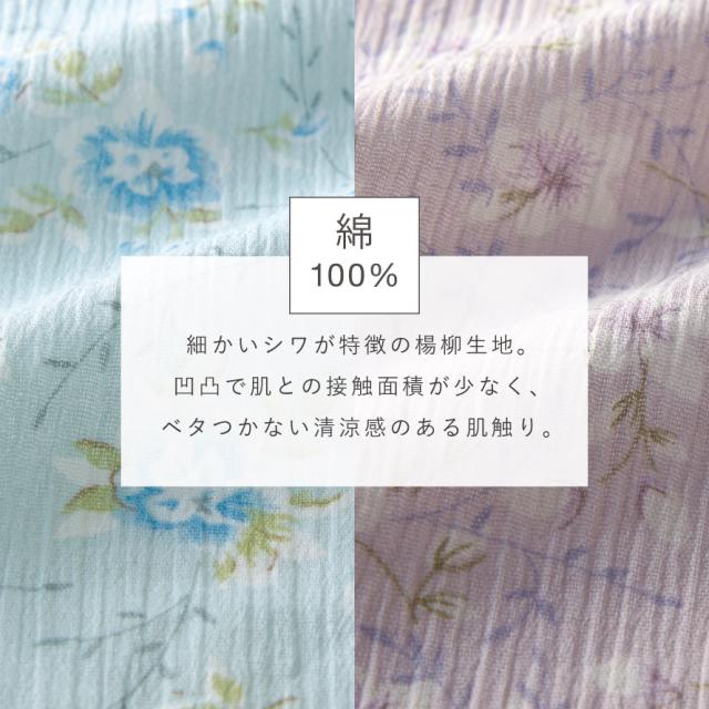 ちりめん状に細かな凹凸が入った楊柳生地は、肌との接触面積が少なく、蒸し暑い日本の夏でもベタつきにくく、さらっとした清涼感が続きます。