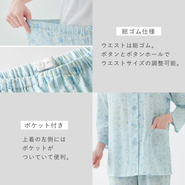 小柄な私の楊柳パジャマ 綿100% 8分袖 シニアパジャマ レディース 小柄 低身長向け 楊柳生地 春 夏 涼しい 前開き 花柄 ゆったり LL 3L 婦人用 入院 高齢者 70代 80代 ウエスト調整可 上下セット 誕生日 母の日 ギフト プレゼント 深股上 着やすい ゴム取替口付き 肌に優しい
