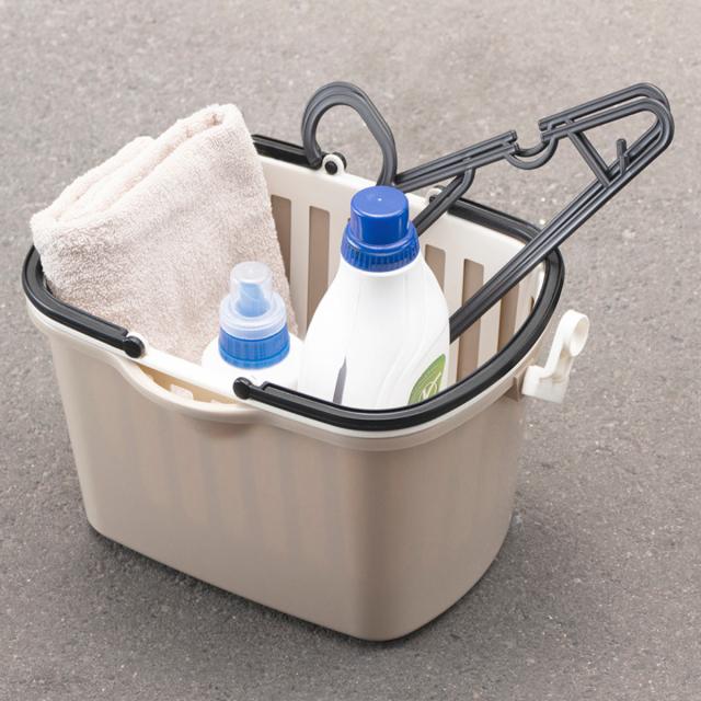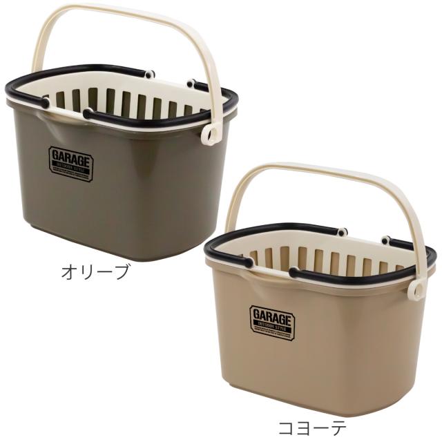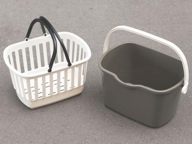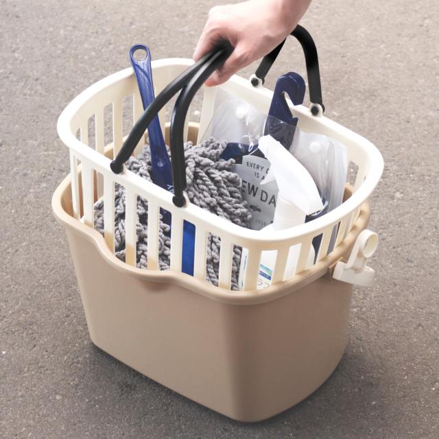 小物を収納できるバスケットと幅広角型バケツのセットです。それぞれにハンドルが付いているので、別々に使用できます。