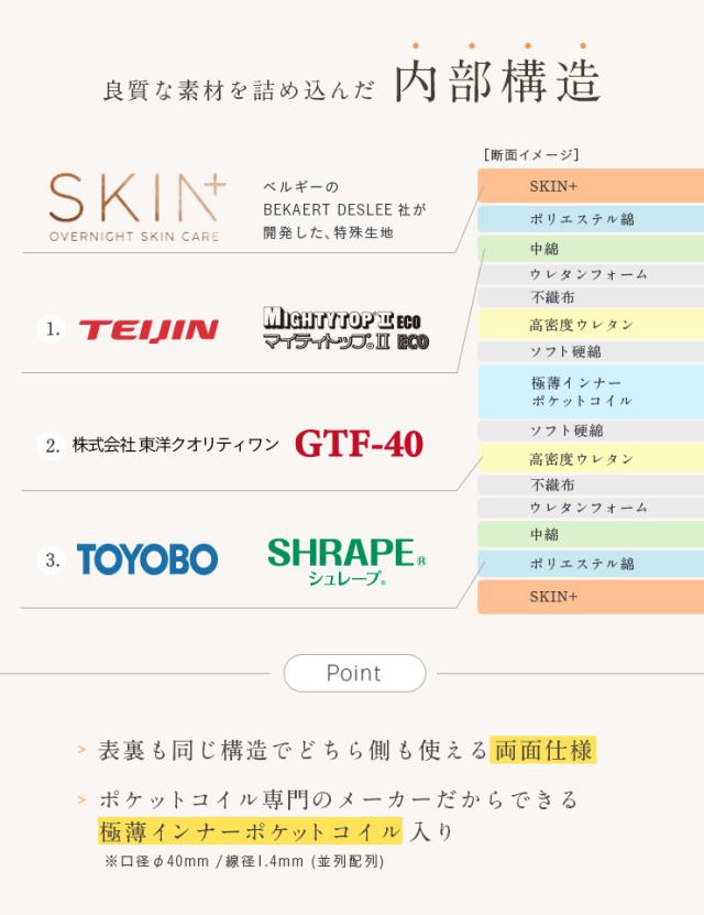 マットレス セミダブルサイズ SKIN+ 120x195cm トッパータイプ スキンケア エイジング 美容 セミダブルベッド ポケットコイル マット 寝心地改善 敷き布団 mattress 快眠 寝具【日本製 5年保証 / 抗菌・防臭・防ダニ】