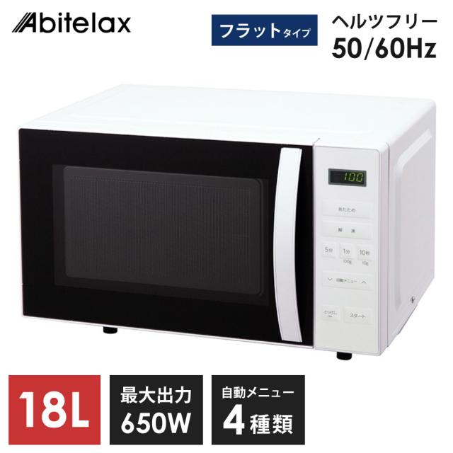 電子レンジ フラット 18L ヘルツフリー 500W 650W 自動メニュー 4種類 解凍 あたため 省エネ Abitelax ARF1801-W