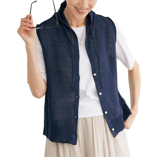 日本製 和紙混ニット ミニフードベスト ネイビー 前開き ベスト ニット レディース 婦人服 ミセス シニア 女性 紺色 コットン 無地 前ボタン フェイクフード シンプル チョッキ シニアファッション 40代 50代 60代 70代 80代 母の日 お母さん 春夏