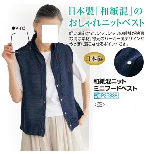 前開き ベスト ニット レディース 日本製 和紙混ニット ミニフードベスト ネイビー 婦人服 ミセス シニア 女性 紺色 コットン 無地 前ボタン フェイクフード シンプル シニアファッション 40代 50代 60代 70代 80代 母の日 お母さん 春夏 和紙素材 nss p25838