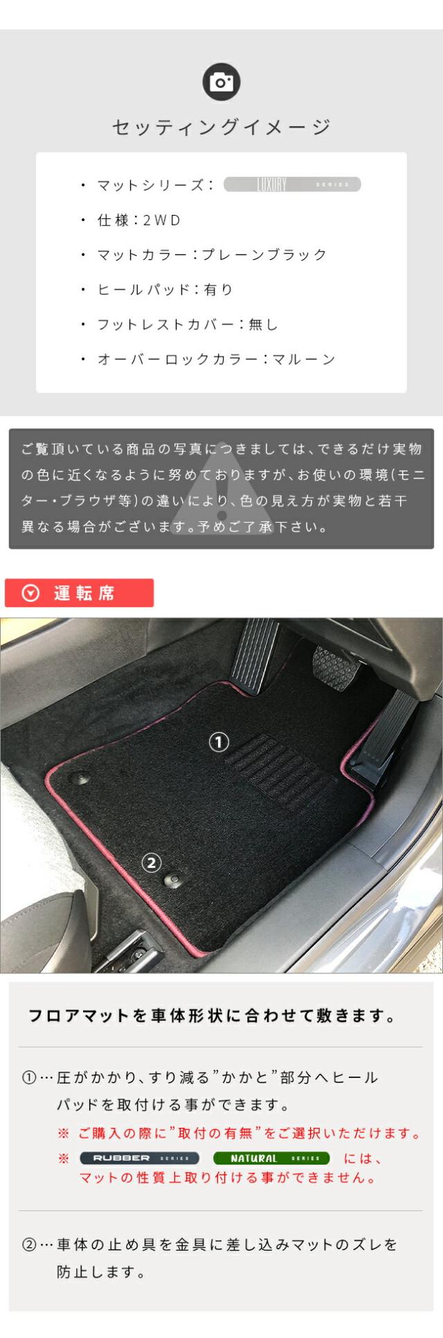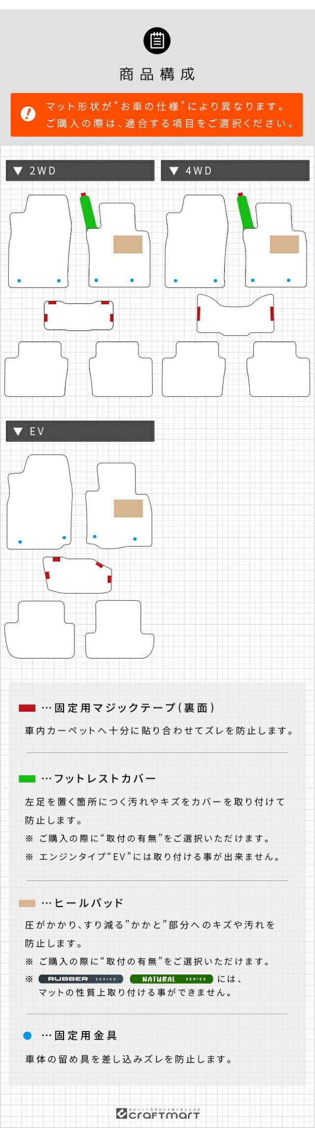 | 商品構成 | 専用フロアマット5枚 (運転席 1枚 / 助手席 1枚 / 後部座席 3枚) ※ マット形状が“お車の仕様”により異なります。ご購入の際は、適合する項目をご選択ください。 |