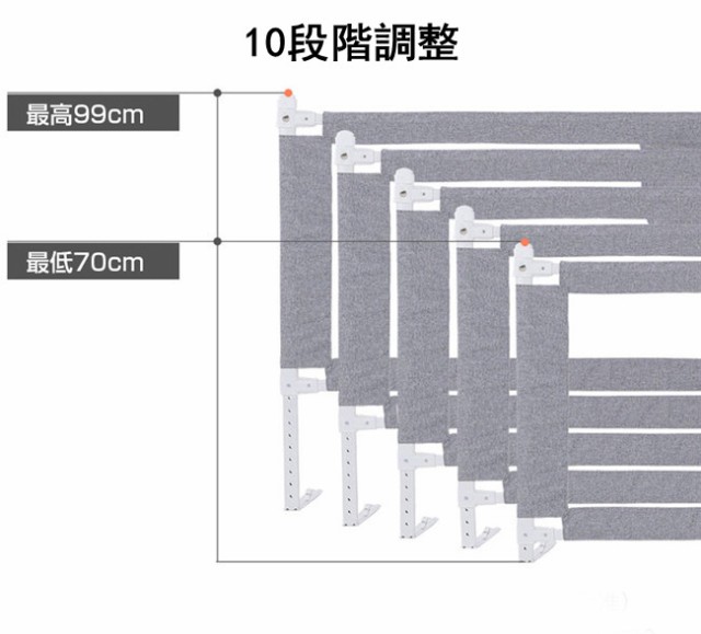 【8段/10段階調節可】ベッドのガードレールは高さ70から92cmまで8段階調整可能であるため、様々の厚さのマットレスと市販のベッドに大幅対応できます。