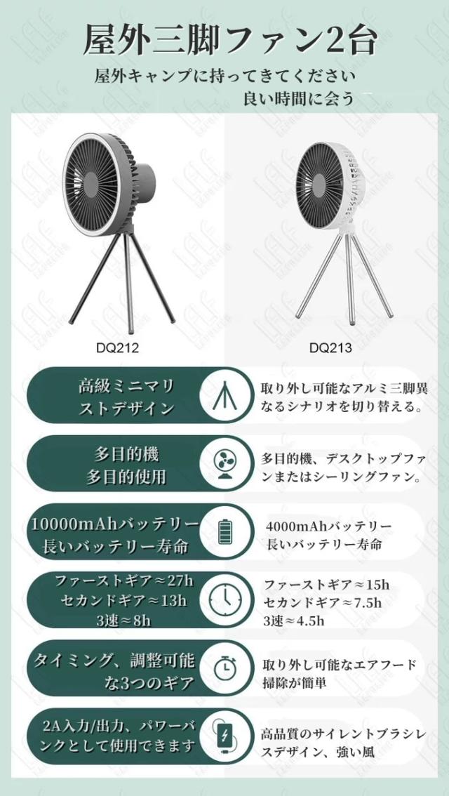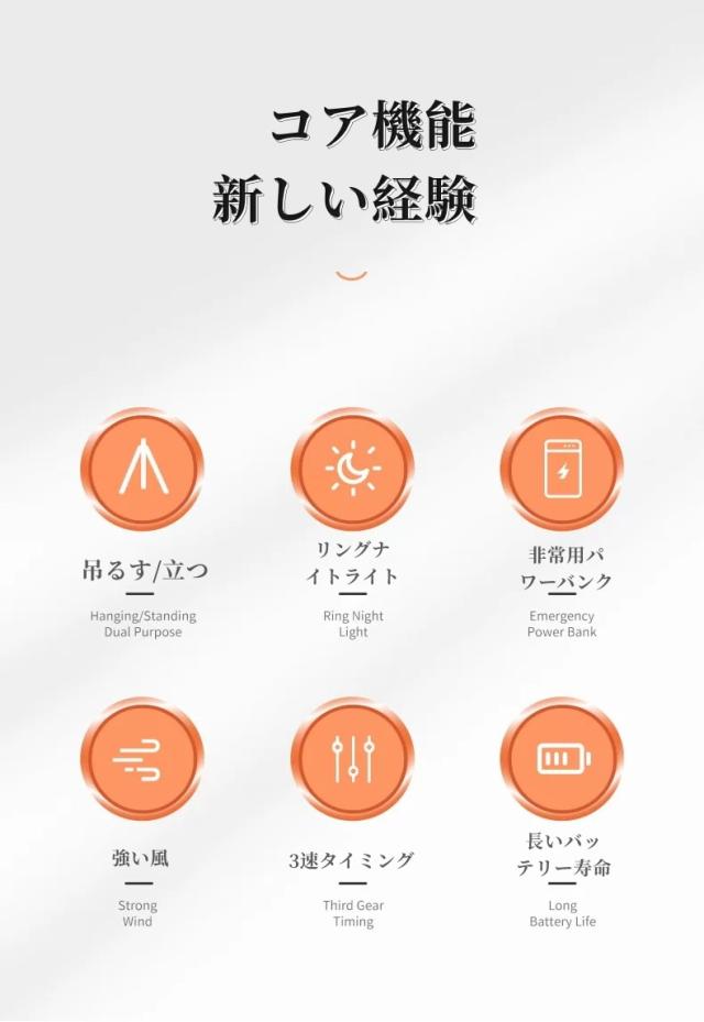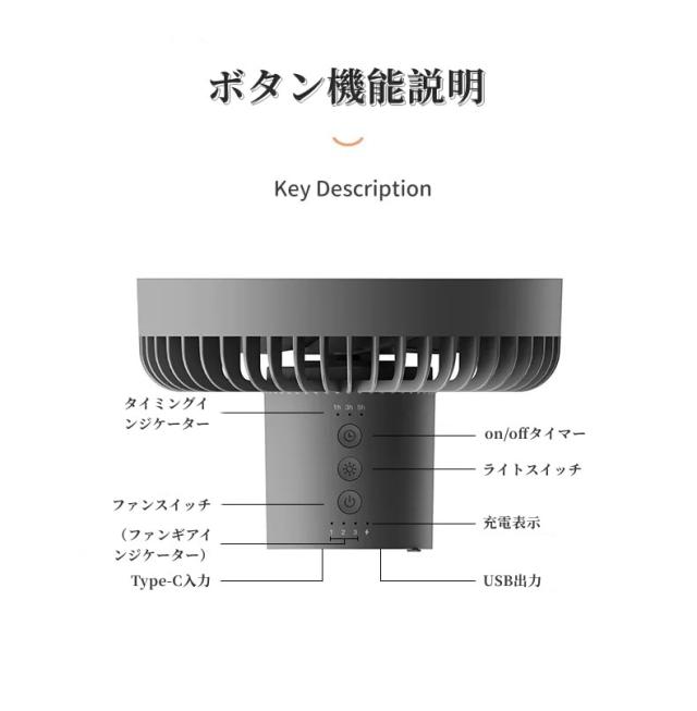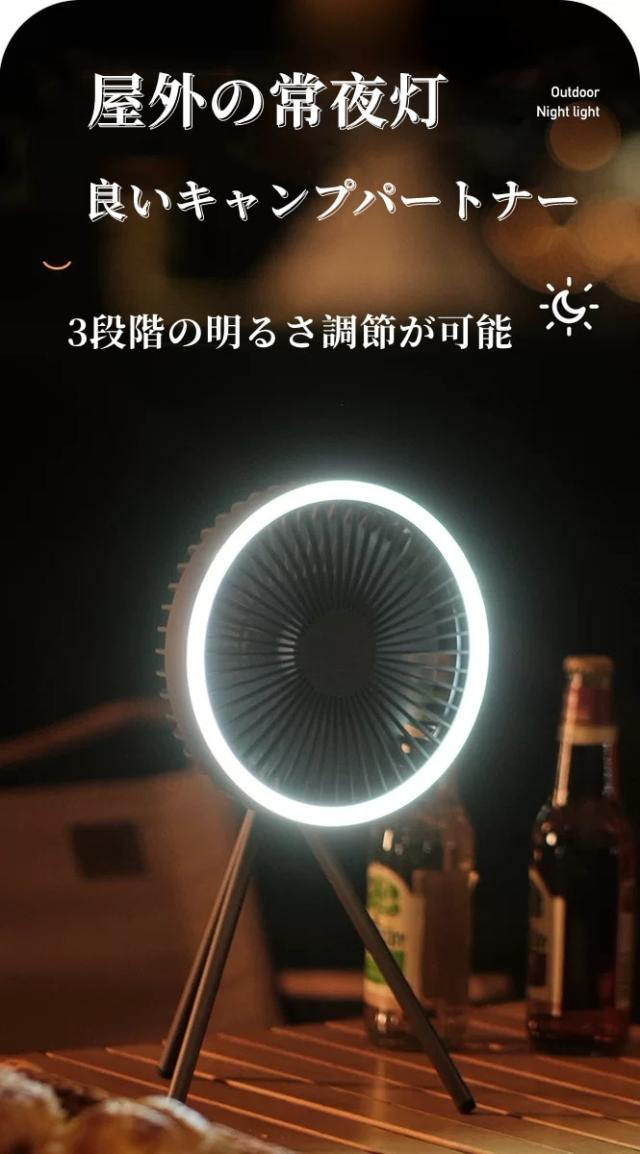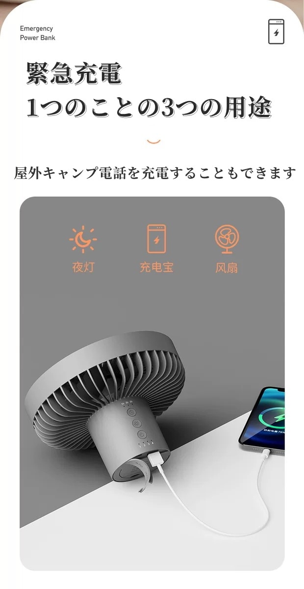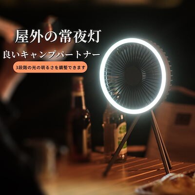 多機能LEDライト:キャンプファンには、テントやキャンプを照らすのに十分な明るさを提供するLEDライトが装備されています。常夜灯機能付き多機能ファン。タイミング機能:3速調整可能1h、3h、5h、2A入出力、パワーバンク機能として使用できます。さまざまな環境で使用できます。