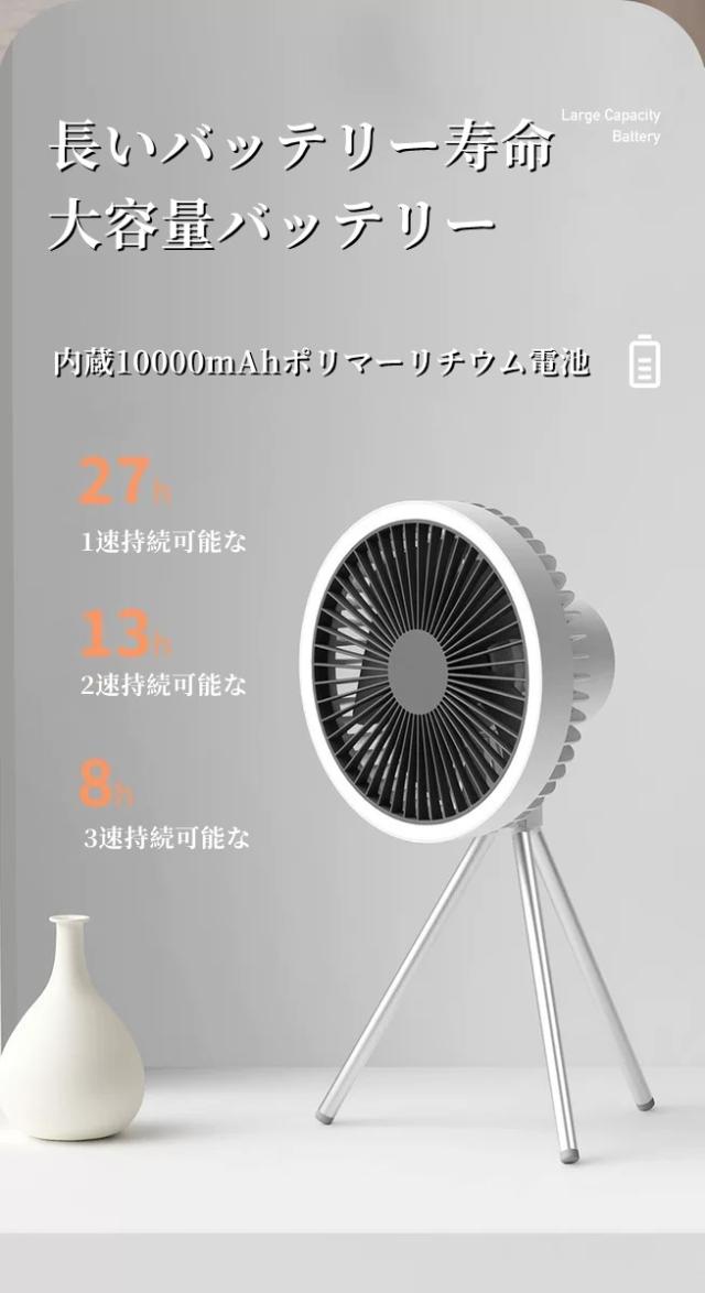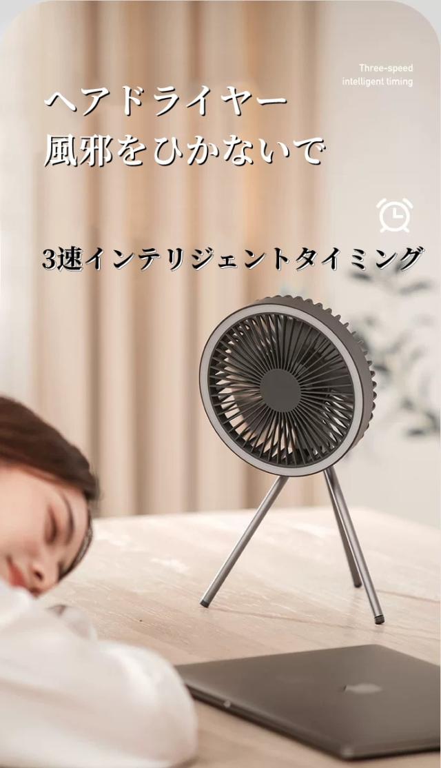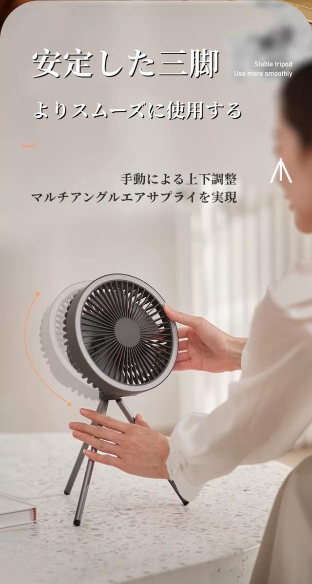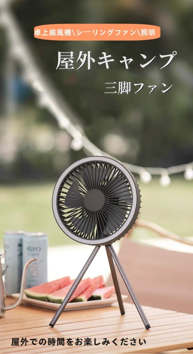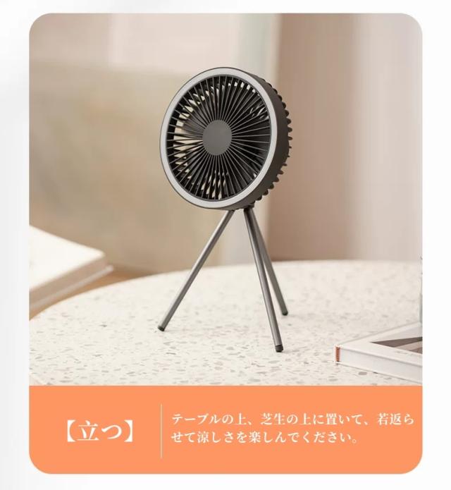 取り付けが簡単:LEDシーリングファンには、卓上での使用に対応した三脚と、テントの上に吊るすことができるフックが付属しています。足裏には滑り止めの柔らかいプラスチックを使用した安定した三脚を採用し、さまざまな場所での使用に対応しています。