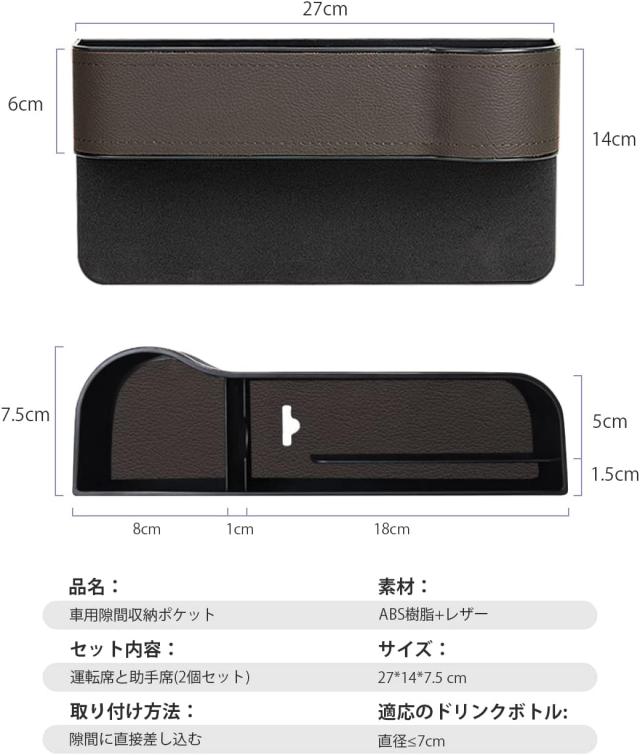 【直接取り付け】シートの隙間に挟むだけの簡単取り付け。空いたスペースを有効に活用できます。小物が隙間に落ちる心配がありません。運転席用と助手席用の2個セット、隙間を埋めて収納スペースを広げます。
