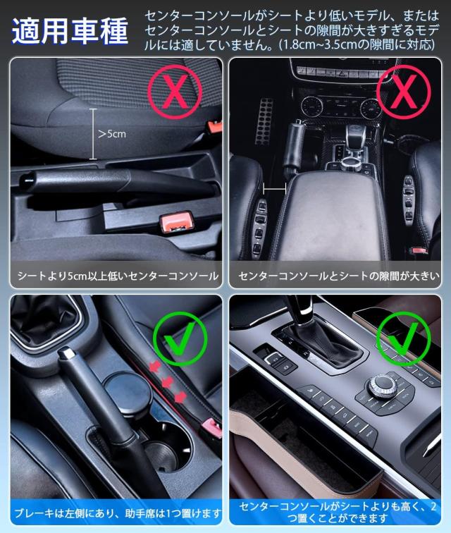 【適用車種】シートより5cm以上低いセンターコンソール、またはセンターコンソールとシートの隙間が大きすぎるモデルには適していません。(1.8cm~3.5cmの隙間に対応)。ご注文前はご愛車は取り付け出来るかどうかをご確認ください。