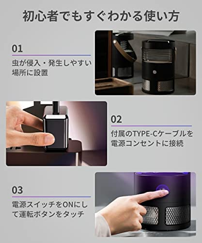 【使い方&お手入れ簡単】 操作が簡単で、初心者でもすぐわかります。虫が侵入しやすい場所に設置し、付属のケーブルをコンセントに挿し、電源スイッチをONにするだけで使えます!また、虫の死骸は捕虫ボックスにたまりますので、簡単に捨てられます!(ご注意:電源を抜いて掃除してください!)
