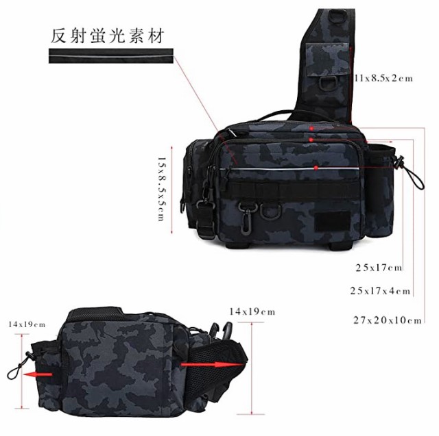 釣りだけに限らず、晴天、雨天、強風に係わらず渓流釣り、堤防夜釣り、船釣り、海釣り、ショアジギング、道具収納バッグ、ハイキングピクニック、釣りの小物ルアー入れなどに最適する多機能釣り用バッグ。