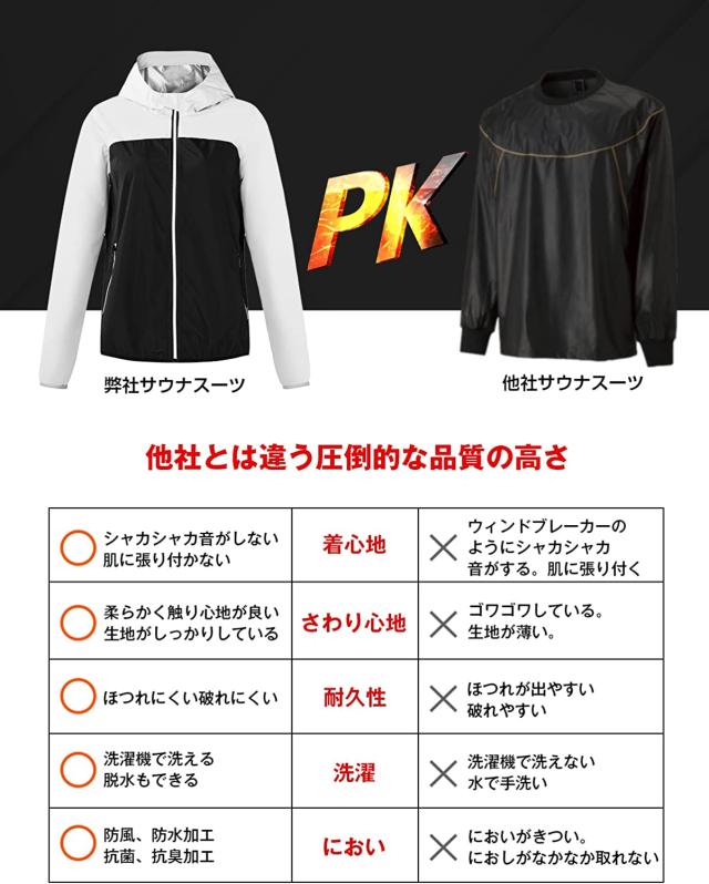 【細部まで妥協しないウナスーツ】「ピッタリフィッド!」:エクササイズの可動域を考えた人体工学を応用した設計に、強度の高い素材と縫製を加え、サウナスーツがハードなトレー二ングにも対応できます。「柔らかの素材だからこそ静音機能付き」:シャカシャカ音が気になる方もご安心して購入できます。「幾つの便利設計を採用」:ポケットが四つありますので、小物を入れるのにはとても便利です。そして弾力のあるゴアウエスト、ゴア付きのズボン口と袖口を採用して、自分の。「大量発汗でも清潔で快適」: 抗サウナスーツが菌性の高い素材を使用しており、臭いの原因菌の発生を抑え、快適な使用感得られます。