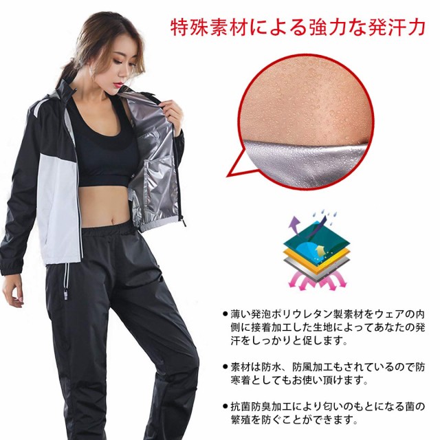 【特殊素材による強力な発汗力】内側に特殊なシルバーコーティング使用し、裾、腕、胴回りのゴムの密閉度を従来のものより200%あげているため、熱を閉込め、少しの運動で汗びっしょりになります。また、デザイン性も通常販売されてるサウナスーツよりスタイリッシュにすることにより、日常生活でも使用でき、着用しているだけで汗が出てくるので効率よくシェイプアップが可能!軽量素材を使用し、動きやすく運動に最適で、上着の下に着ても目立ちません。また、素材は防水、防風加工もされているので防寒着としてもお使い頂けます。