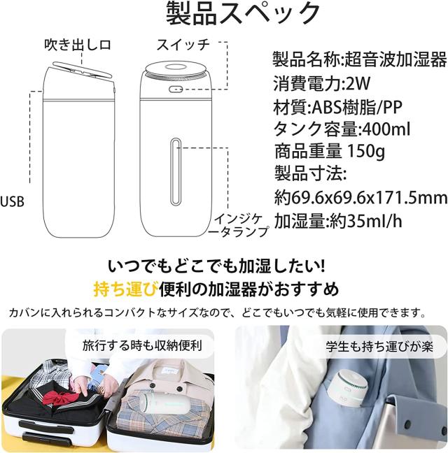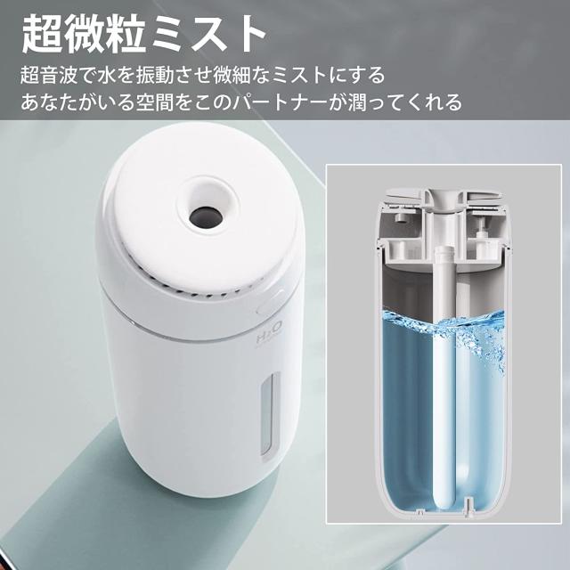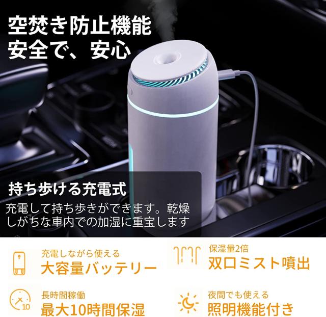 加湿器 USB充電式 卓上加湿器 車載加湿器 超音波式 小型 400ml 【2022新登場&除菌】長時間持続 静音