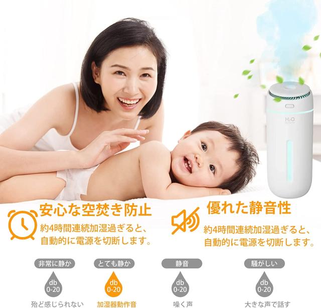 【 空焚き防止・アロマ】【 空焚き防止・アロマ】空焚き防止機能付きで、4時間以上の連続運転や、水が不足の際には自動的に運転を停止します。就寝中も安心してご使用いただけます。水溶性のアロマウオーターも利用でき、いつ、どこでも気分転換にしよう〜空焚き防止機能付きで、4時間以上の連続運転や、水が不足の際には自動的に運転を停止します。就寝中も安心してご使用いただけます。加湿器 本体*1、綿棒(交換用)*1、USB給電ケーブル*1、日本語取扱説明書*1。