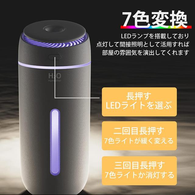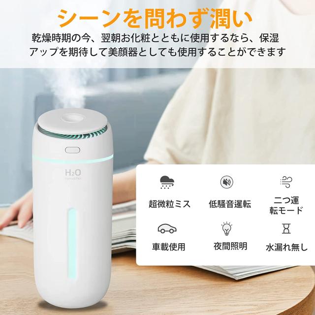 【USB給電・持ち運び簡単】USB給電口を備えているため、パソコンやモバイルバッテリーなどから電源を取れます。69.6*69.6*171.5mmのコンパクトサイズで、持ち歩ける加湿器として、旅行、車用、寝室、オフィスなどに非常に便利です。独自設計の水漏れ防止技術を採用して、360°転倒しても水漏れしなく、安全に加湿できます。