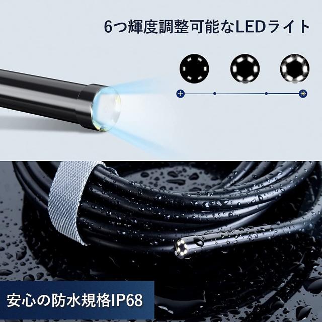 【6LEDライト搭載?IP68防水】高感度LED6灯搭載され、ライト付き検査カメラの先端には明るさ調整機能付きLEDライトを内臓で、暗い配管の中でも、目でハッキリと確認できます。★世界基準のIP68防水レベルがあり、水に入れて水中の生き物の観察にも使えます。つまり低照度領域や暗領域、湿気や濡れた領域など、様々なタイプの環境に適しております。水中カメラとしてもいいですし、拡大鏡であり、内視鏡検査であり、マイクロスコープです。