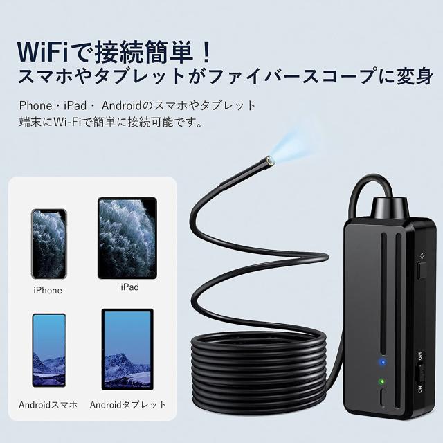 【WiFi接続?外部電源不要】ワイヤレス設計、WiFiで簡単にデバイスに接続できます。スマホ・ iphone ・android・ ios(上記のISO6.0) など機種対応します。また、ファイバースコープカメラは電池内蔵し、最大1.5h連続動作なので、エンドスコープを使用する際には、外部電源及び外部電源ケーブルが必要ないので便利です。