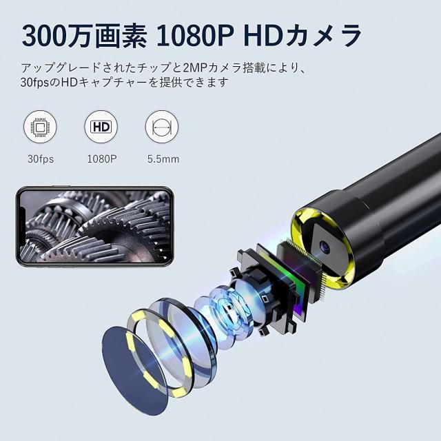 ワイヤレス内視鏡 wifi接続ファイバースコープ1080P エンドスコープ検査カメラ5.5mm極細レンズ 録画可能 防水仕様 スネークカメラ 5Mケーブル技適認証済み 日本語取扱説明書