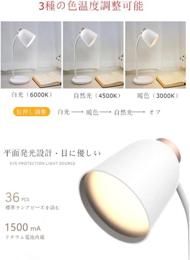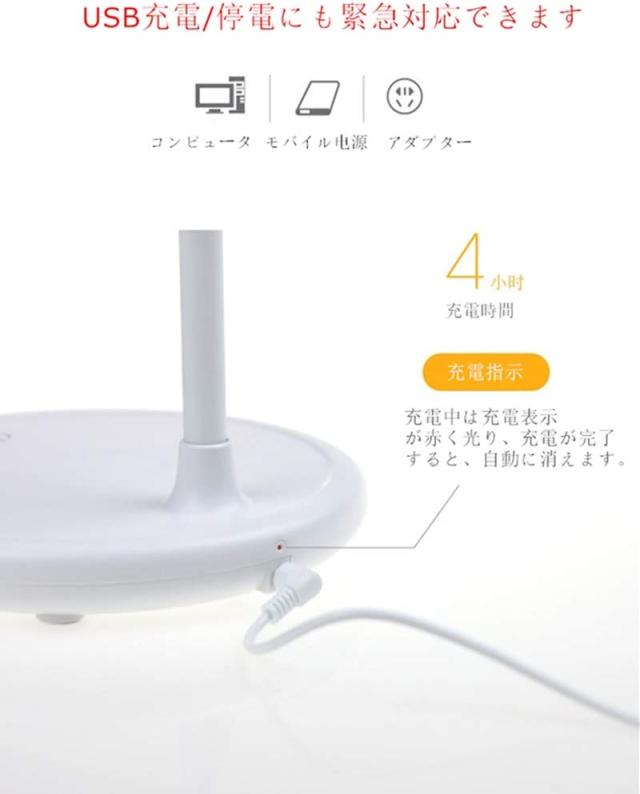 【USB充電式・充電池内蔵】本製品は1200mAhのリチウムバッテリーを内蔵されて、USBで充電すれば電源が無くても使用可能の仕様です。また、このスタンドライトはUSB充電ポートが付属しています。読書しながらデバイスを充電することができて、かなり便利です。停電にも緊急対応できます。ご注意:初回の充電は4時間にしてください。