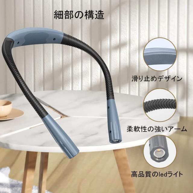 【人間工学デザイン】金属&シリコン&ABS材料利用し、重さはわずか152gです。左右のアームは約25cmで、柔軟性が強くて360度調整できます。また、ネックライトは滑り止めデザインを採用し、安定性が高いです。