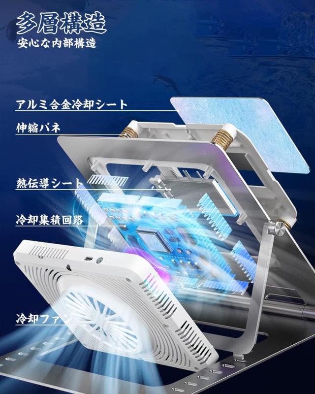【造りは精工、高級感有り】スタンドは頑丈なアルミ合金の素材で作られた、精密加工および研磨し、表面はサンドブラスト加工で、高級感が溢れた、シンプルで美しいフォルムを追究しました、安定性が抜群、三角結構で最大まで15kg耐えられます。●冷却ペルチェ素子に伸縮性あるバネを内蔵し、機器重量の下で完璧に接触ができて、接触の部分にもアルミ合金製で、超大な冷却面積が118cm2や231W/(m*k)の熱伝導率より、長時間の使用や夏場の使用で熱暴走も変わらなく、有効的に温度上昇を抑えることができます。