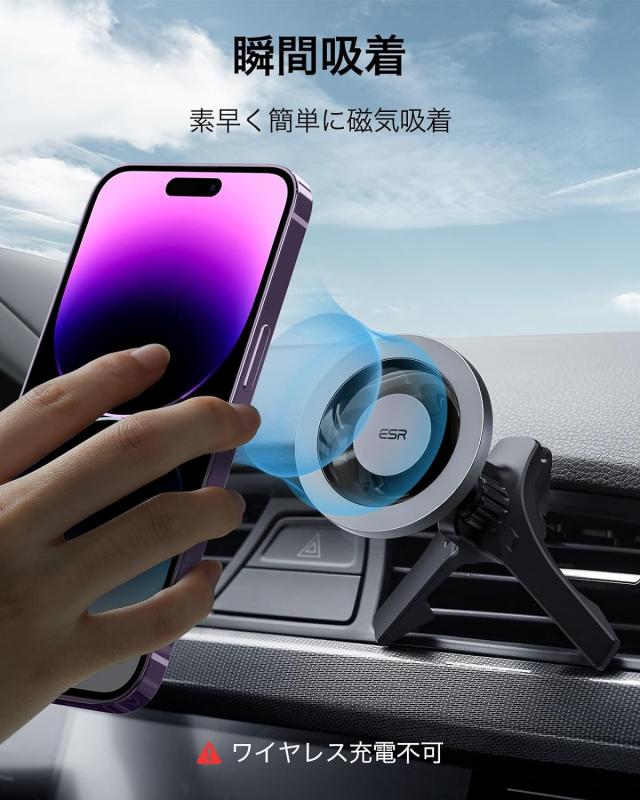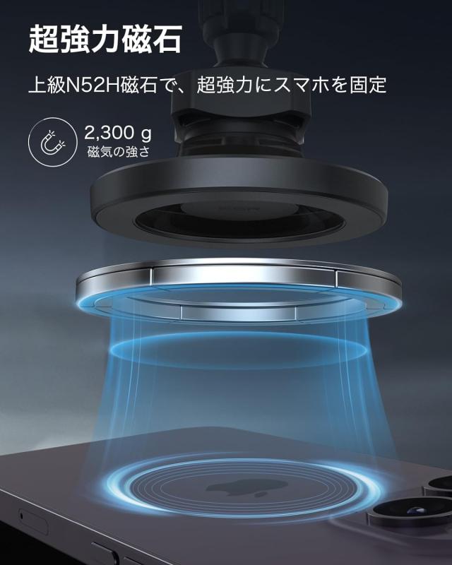 【超強力磁石】2300gの吸着力を備えた上級N52H磁石でスマホをしっかり固定します。ケースと組み合わせて、最強な吸着力を実現します。ワイヤレス充電不可。