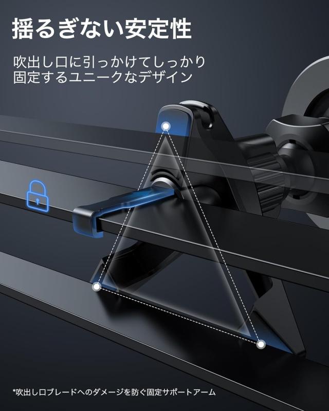 【がっちり固定】独自の設計でエアコン吹き出し口に取り付けられ、しっかりと固定できます。アームのサポートにより更に安定し、非常にでこぼこした道でもしっかり固定され、安心して使用できます。