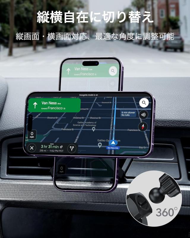 【多様な使い勝手】360度回転可能なフックで、縦フィン、横フィン、円形フィン、網目フィンのすべてのタイプのエアコン吹き出し口に対応します。iPhone12シリーズ以降でのみ使用可能。