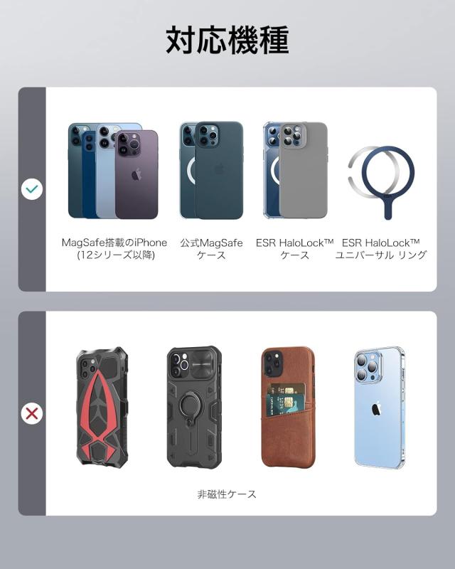 【瞬間吸着】360度のマグネットリングはiPhone 15/14/13/12シリーズの磁気タイプと完全にマッチし瞬時に吸着します。その他のどのiPhoneのモデル(iPhone7/8/SE2/SE3/X/Xs/XR/11/11 Pro/11 Pro Max)にも対応しておりません。