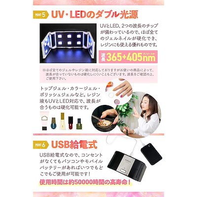 【波長】UVとLEDライトの波長は365+405nmです。 UVネイルライトはUVレジン、UV硬化樹脂、UV接着剤、ジェルネイル用ジェル等幅広くご使用していただけます。 ※ご使用のUVレジンやジェルネイルようのジェルの種類により、硬化時間が異なる場合がございます。未硬化になっている場合は、再び照射してください。