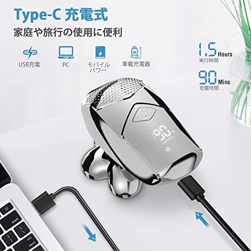 【Type-C USB急速充電】充電式電気シェーバーは1.5時間完全充電後、最大90分のシェービングをサポートします。メインである5Dフローティングヘッドは60分使えます。メンズシェーバーをPC、パワーバンク、車の充電器、または直接電源接続などで充電でき、家庭や旅行に適合します。商品をはじめに使用するとき、商品電力をチェックお願いします。電力がない場合、商品が動けません。