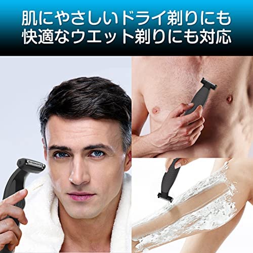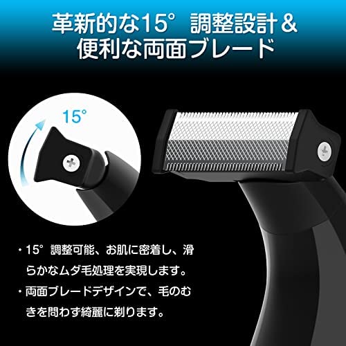 【15°角度調整&双方向トリミング】ボディシェーバーのヘッド部分は15°回転角度を調整可能で、肌に密着し、細かい部分も綺麗に剃れます。両面ブレードを設計と双方向前後どちらにもトリミングできるの構造で、毛がさまざまな方向に生えていても、しっかりキャッチしてカットできます。