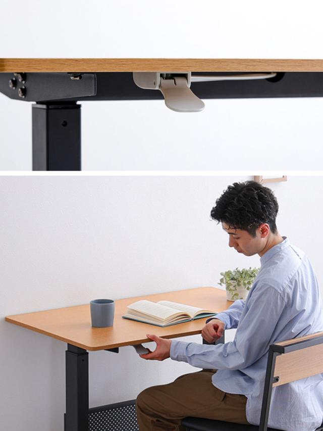 無段階昇降テーブルで自分に合った最適な高さで使うことができるテーブルです。座りっぱなしになりがちなデスクワークの際に、「立つ」を取り入れることで座りすぎを防ぎ、身体への負担も減らすことができます。