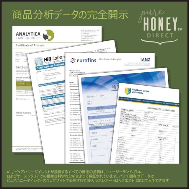 ◆商品データの開示: お買い上げ商品のマヌカ分析(MGO/DHA/HMF)報告書をご提供いたします。