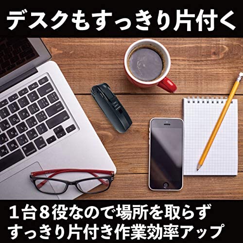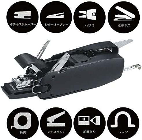 ホチキス、コンパクトパンチ、ハサミ、巻き尺、レターオープナー、鉛筆削り、ホチキスリムーバーなどの役立つ便利な機能を8つ搭載した携帯型マルチツールです。