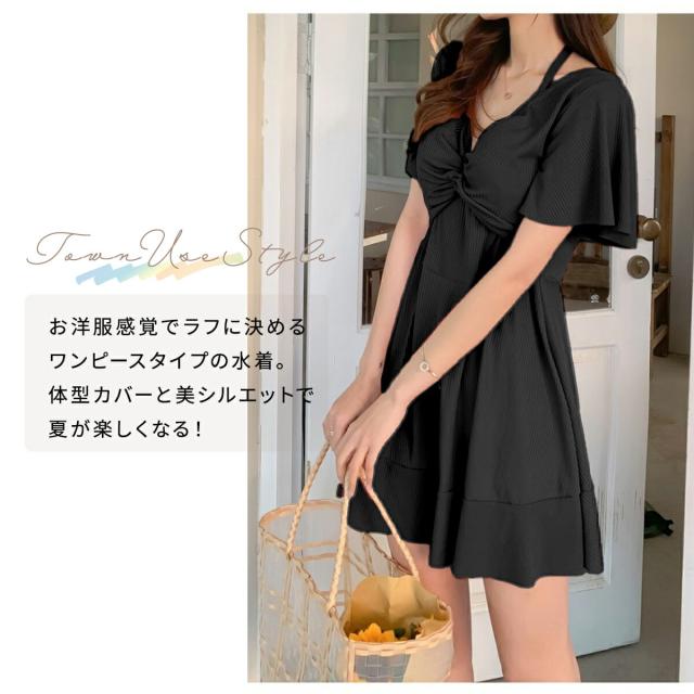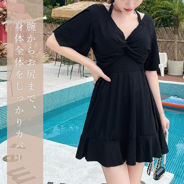 水着 レディース 体型カバー ワンピース 胸パッド付き ぽっちゃり 中学生 大人 ママ 小胸 高校生 水陸 短袖 半袖 フリル 海 プール プチプラ おしゃれ 袖付き オトナ女子 オフショル オフショルダー かわいい 韓国 可愛い 体型 黒 シンプル