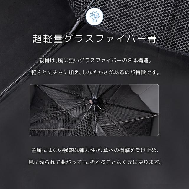 | 【軽くて丈夫なグラスファイバー】 風の影響を強く受ける親骨部には、しなやかなカーボンファイバーを使用。 鉄やアルミに比べて強度があり、非常に軽量な材質です。 |