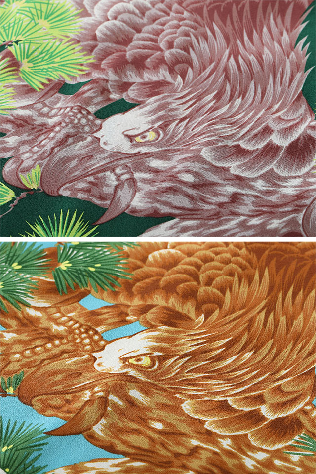 メイン・モチーフの鷹とグラウンドに描かれた松の枝と葉で構成されたシンプルな作品ですが、そこから伝わる躍動感と迫力は他の鷹や鷲を題材にした柄の中でも一際目立つ存在です。