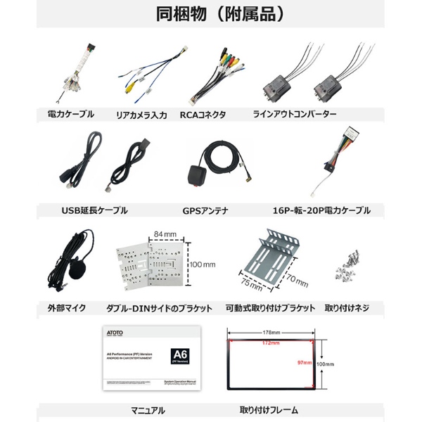 ※取り付けサービスは行っておりません。 ※初期不良等の場合に発生する取付・取外し作業や、車両に関わる保障はございません。あらかじめご了承願います。 ※車両により、取り付けキットが必要な場合がございます。必ずメーカーページにてご確認ください。 ブランド:ATOTO 製品モデル:ATOTO A6 Performance(PF) 8コアARM Cortex-A55、1.6 GHz Android 10.0 2GB+32 GB HD1024*600 7インチ IPSタッチディスプレイ 2DIN取付サイズ(192mm×97mm) ※記載は商品仕様の一部です。仕様説明不足等の理由での返品はできません。特に適合等は必ずご確認ください。