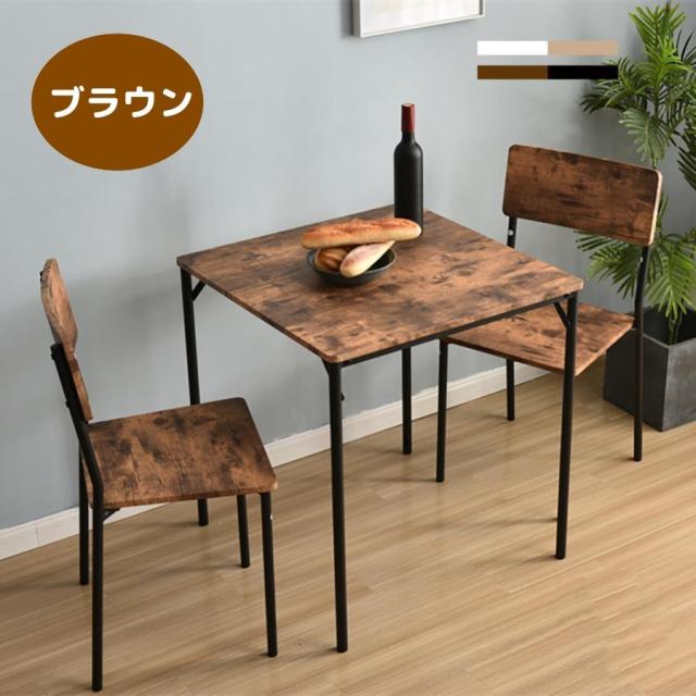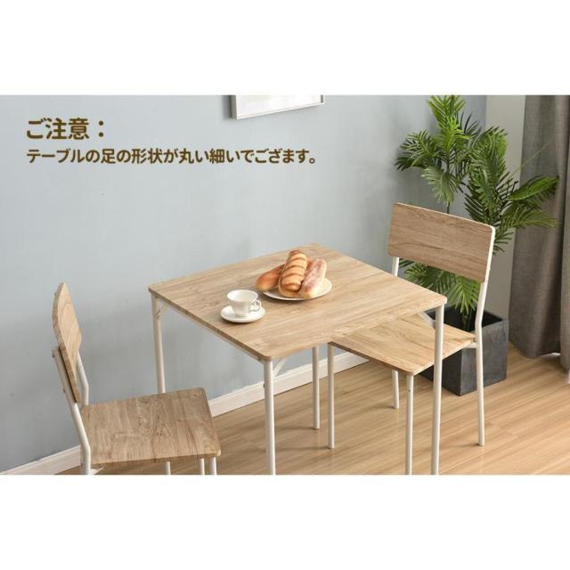 【ちょうどいいサイズ感】お部屋に置いても圧迫感を感じにくいこのサイズ。一人暮らしやカップルにぴったりです。【テーブル】:(約)幅約70×奥行約70×高さ約75cm【チェア】幅約40×奥行約44×高さ約86cm(座面高さ:45cm)【角度設計されたシンプルで美しいチェア】シンプルでかつ座りやすさを考慮したデザインにしました。背もたれは角度をつけ、背中にあたる部分は少しカーブさせフィット感を。角度がついて座りやすい設計。ゆるやかなカーブで背中にフィットします。【美しく丈夫な木目調PVC化粧板】木目調の天板はお手入れしやすい加工を施した化粧繊維板を使用。天然木では染み込んでしまう汚れもサッとひと拭きでキレイに!天板、椅子の柄部分は優れた機能性を持ったPVC化粧板です。水や汚れに強くさっと拭くだけで綺麗に。 角があたっても痛くない丸みがあるつくり【コンパクトでスタイリッシュなダイニングセット】デザイン性もあってコンパクトなダイニングだから、お部屋に余裕ができてお洒落な空間へ。