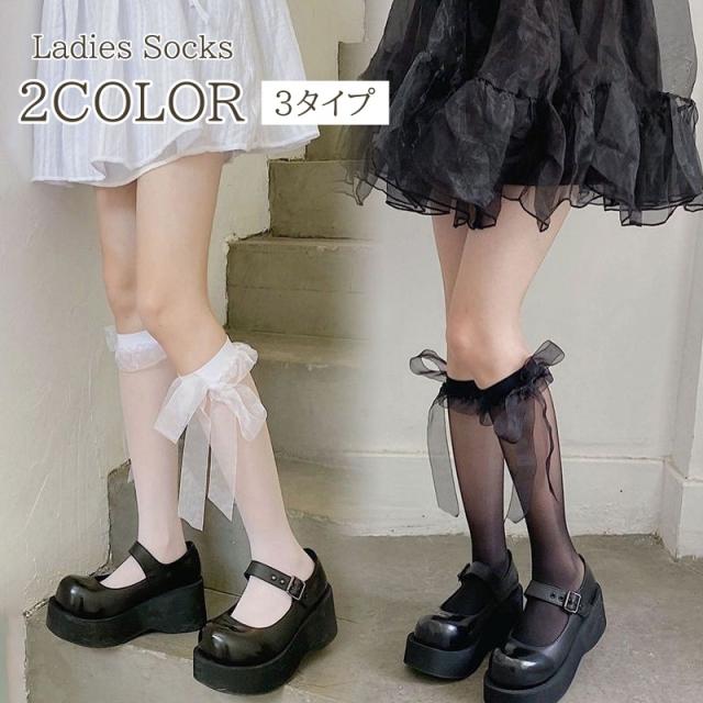 ハイソックス レディース ソックス 靴下 シースルー リボン フリル ロリータ ゴシック ゴスロリ かわいい おしゃれ 女性 コ