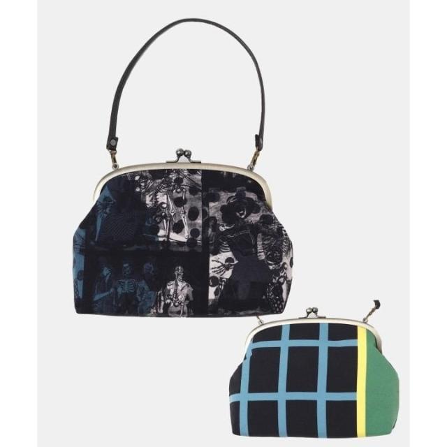着物・オブジェ作家「重宗玉緒」とのコラボ商品。メインテーマ「メメントモリ(死を想え)」に沿った、絵画のような着物や帯・オブジェを制作する他、作家自身が欲しいと思うファッションとして先鋭的なアイテムを、完全オリジナル、他にはない物作りにこだわって制作。英国立博物館に作品が永年収蔵され、海外でも展示会やビジュアル撮影を行うなど幅広く活動している。表裏にそれぞれ違ったデザインの入った手持ちがま口。和装にも洋装にも合わせやすく、メインバッグとして重宝します。