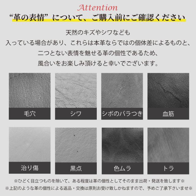 | 注意事項 | 当店で使用している本革は全て本物の革を使用しています。 その為、皮革の模様など掲載画面と異なる場合がございます。 ※ご覧頂いている商品の写真につきましては、できるだけ実物の色に近くなるように努めておりますが、 お使いの環境(モニター、ブラウザ等)の違いにより、色の見え方が実物と若干異なる場合がございます。※ ※掲載商品と色味、模様・柄が異なる理由などのイメージ違いで返品・交換の場合は、返送料お客様ご負担での返送をお願いしております。 予めご了承くださいませ。※ |