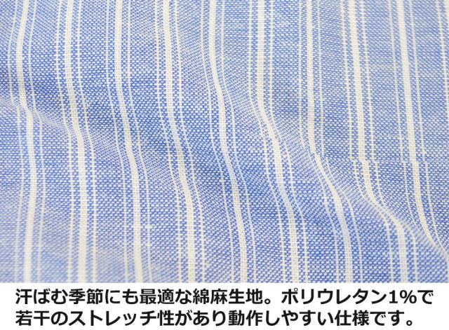 ■凄く伸びる訳ではありませんが従来全くストレッチ性のない天然素材、綿麻素材にポリウレタンを1%混紡する事で生活動作がしやすく快適な着用感を実現。