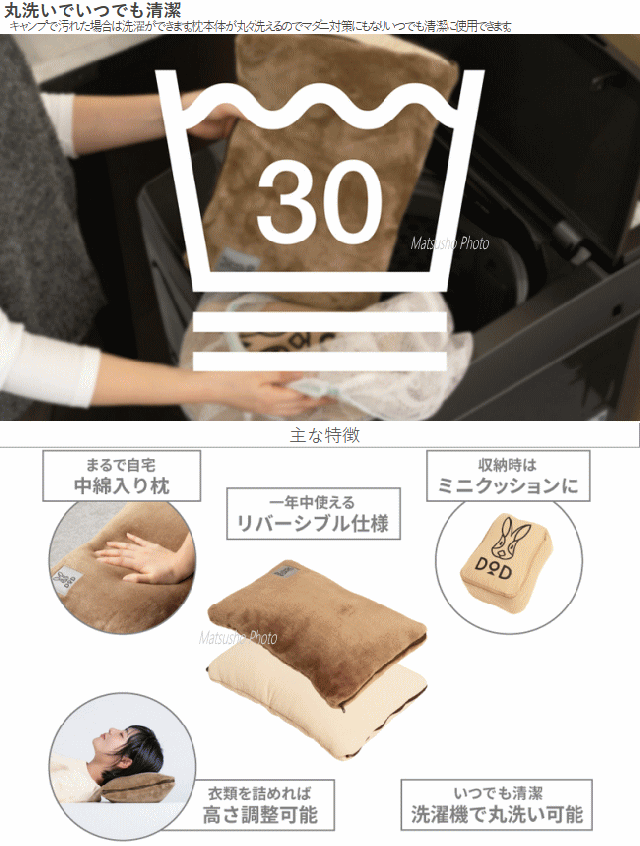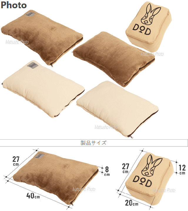 キャンプをするのは年間でもほんの数日で家の中で眠ってる事が多いキャンプ用品。ミニウサクッションマクラは寝室、リビング、車の中等あらゆる日常のシーンに溶け込むアイテム。キャンプ用枕のほとんどが収納サイズを優先したインフレータブル式ですがミニウサクッションマクラは自宅の様な寝心地を実現する為に綿入りの枕にしました。片面は接触冷感生地のひんやり素材。もう片面はモフモフ生地のあったか素材。季節に合わせて使えるリバーシブル仕様。クッションから中身を取り出すと枕になります。車の移動中は抱っこしたり腰に敷いてランバーサポートとして。またキャンプ場に着いたら枕としてという使い分けができます。マクラ内に衣類やタオル等を挟み込む事ができます。詰め込む量によってお好みの高さに調整が可能。キャンプで汚れた場合は洗濯ができます。枕本体が丸々洗えるのでマダニ対策にもなりいつでも清潔に使用できます。■サイズ約W40×D27×H8cm■収納サイズ約W27×D20×H12cm■総重量約390g■セット内容製品:本体、キャリーバッグ(クッションカバー)※洗濯表示に従って洗濯して下さい。