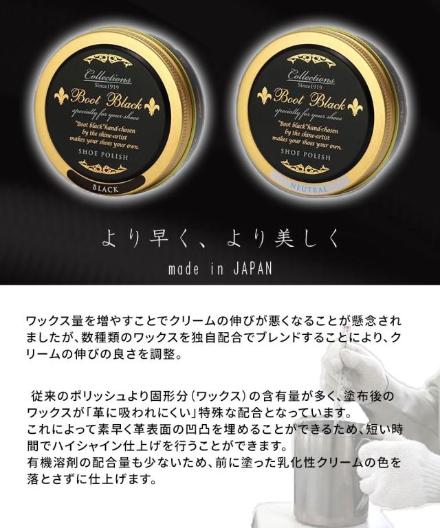 タンナー様から靴小売店様にいたるまで、すべての皮革関連業態に100年以上の長きに渡り、靴仕上げ剤・靴クリームを提供してきた株式会社コロンブスが、その知識と開発力を結集して作り上げた、ジャパンメイドのニューブランド"BootBlack"シリーズ。