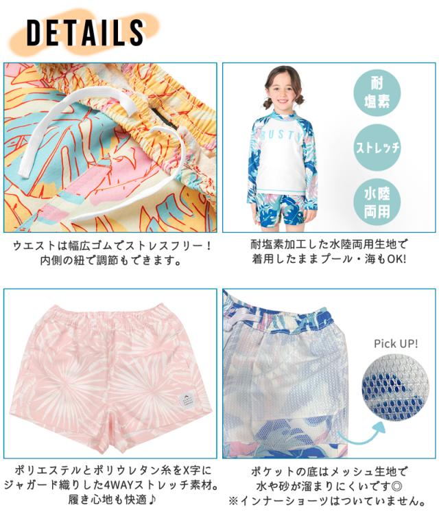 ラスティ キッズ ラッシュ サーフ パンツ ショーツ 子供 耐塩素 水陸両用 リーフ柄 ロゴ サーフブランド 120 130 140 150 海 プール 962402 : RUSTY